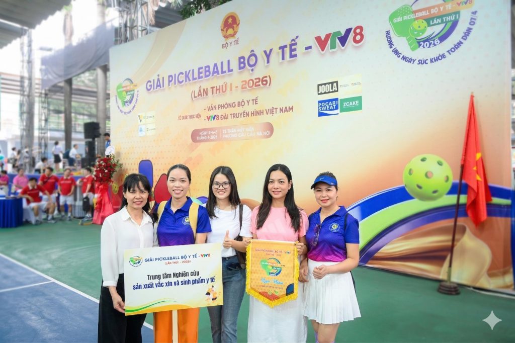 Hòa chung không khí rộn ràng hướng tới Ngày Sức khỏe toàn dân (07/4), từ ngày 03/4 đến 05/4/2026, đoàn vận động viên của Trung tâm Nghiên cứu Sản xuất Vắc xin và Sinh phẩm Y tế (POLYVAC) đã tham gia tranh tài tại Giải Pickleball Bộ Y tế – VTV8 lần thứ I. Bằng tinh thần thể thao nhiệt huyết, đội thi của POLYVAC đã xuất sắc mang về Giải Ba ở nội dung Đôi nam nữ dưới 45 tuổi.
