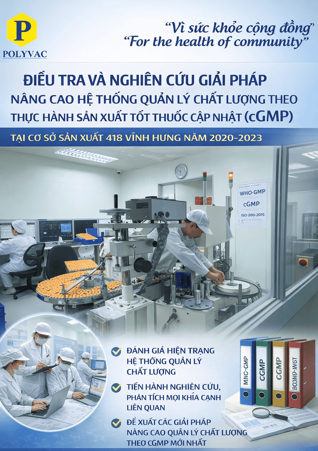 Nghiên cứu All Đề tài nghiên cứu khoa học cấp nhà nướcSản phẩm đang nghiên cứuĐề tài nghiên cứu khoa học cấp cơ sởĐề tài phối hợp với các tổ chức trong và ngoài nướcĐề tài cấp Bộ Đề tài nghiên cứu khoa học cấp nhà nước Nghiên cứu ứng dụng công nghệ mRNA trong sản xuất vắc xin phòng bệnh Sản phẩm đang nghiên cứu Khay thử xét nghiệm định tính kháng nguyên vi rút Rubella Sản phẩm đang nghiên cứu Khay thử xét nghiệm định tính kháng nguyên vi rút Rota Sản phẩm đang nghiên cứu Que thử xét nghiệm định tính kháng nguyên NS1 của vi rút Dengue Sản phẩm đang nghiên cứu Khay thử xét nghiệm định tính kháng nguyên vi rút Cúm gây bệnh cúm A/B Đề tài nghiên cứu khoa học cấp cơ sở Thiết lập quy trình sản xuất và đánh giá đặc tính của khay thử xét nghiệm phát hiện vi rút Dengue gây bệnh sốt xuất huyết do POLYVAC sản xuất từ bán thành phẩm nhập khẩu. Đề tài nghiên cứu khoa học cấp cơ sở Thiết lập quy trình sản xuất và đánh giá đặc tính trên khay thử xét nghiệm phát hiện vi rút Cúm gây bệnh cúm A/B do POLYVAC sản xuất từ bán thành phẩm nhập. Đề tài nghiên cứu khoa học cấp cơ sở Nghiên cứu ảnh hưởng của kháng sinh Erythromycin tới hiệu giá vắc xin trong sản xuất vắc xin Sởi BTP, tối ưu hóa hàm lượng kháng sinh trong các môi trường nuôi cấy Đề tài phối hợp với các tổ chức trong và ngoài nước Thử nghiệm lâm sàng giai đoạn III, ngẫu nhiên, mù kép không hoàn toàn, có đối chứng để so sánh tính sinh miễn dịch và tính an toàn của vắc xin Rotavin dạng dung dịch với vắc xin hiện đang được cấp phép dạng đông băng (Rotavin-M1) trên trẻ em khỏe mạnh tại Việt Nam Đề tài nghiên cứu khoa học cấp cơ sở Thiết lập quy trình và đánh giá tính phù hợp của bộ Kit QIAGEN ONESTEP RT-PCR Kit (100) cho thử nghiệm nhận dạng virut Rota tại POLYVAC Đề tài nghiên cứu khoa học cấp cơ sở Thiết lập và đánh giá chất lượng ngân hàng tế bào từ dòng tế bào RK13- CCL-37 lot 01/18 và Vero 76-NICVB/WCB01-19 chuẩn quốc gia dùng trong kiểm định vắc xin sởi, vắc xin rubella tại POLYVAC Đề tài nghiên cứu khoa học cấp cơ sở Đánh giá tính an toàn của vắc xin Rotavin-M1 dựa trên các dữ liệu Cảnh giác Dược ở Nam Định và Huế từ 12/2017 -11/2020 Đề tài nghiên cứu khoa học cấp cơ sở Bước đầu khảo sát qui trình sản xuất vắc xin Rota bán thành phẩm trên hệ thống nuôi cấy thủy triều Đề tài nghiên cứu khoa học cấp cơ sở Bước đầu đánh giá chất lượng trứng gà SPF Thái Lan sử dụng trong sản xuất vắc xin sởi bán thành phẩm. Đề tài nghiên cứu khoa học cấp cơ sở Điều tra thực trạng và nghiên cứu giải pháp nhằm nâng cao hệ thống quản lý chất lượng theo yêu cầu thực hành sản xuất tốt thuốc cập nhật (cGMP) tại cơ sở sản xuất 418 Vĩnh Hưng. Đề tài nghiên cứu khoa học cấp cơ sở Đánh giá thực trạng áp dụng các biện pháp phòng chống côn trùng, động vật gặm nhấm và đề xuất biện pháp kiểm soát tại cơ sở 135 Lò Đúc, Trung tâm Nghiên cứu Sản xuất Vắc xin và Sinh phẩm Y tế. Đề tài nghiên cứu khoa học cấp cơ sở Đánh giá tính an toàn của vắc xin sởi do POLYVAC sản xuất thông qua hoạt động của hệ thống cảnh giác dược Đề tài nghiên cứu khoa học cấp cơ sở Xây dựng và đánh giá hiệu quả quy trình xông phòng bằng dung dịch H2O2 tại cơ sở 418 Vĩnh Hưng Đề tài nghiên cứu khoa học cấp cơ sở Nghiên cứu quy trình sản xuất vắc xin phối hợp sởi-rubella thành phẩm liều đơn. Đề tài nghiên cứu khoa học cấp cơ sở Nghiên cứu hạn sử dụng của môi trường, dung dịch sử dụng cho sản xuất và kiểm định vắc xin ở 418 Vĩnh Hưng Đề tài cấp Bộ Nghiên cứu sản xuất huyết thanh kháng rubella ứng dụng trong kiểm định vắc xin và phát triển sinh phẩm chẩn đoán. Đề tài nghiên cứu khoa học cấp nhà nước Hoàn thiện qui trình công nghệ sản xuất vắc xin Sởi đạt tiêu chuẩn tiền thẩm định của Tổ chức Y tế Thế giới, WHO Đề tài nghiên cứu khoa học cấp cơ sở Nghiên cứu quy trình sản xuất vắc xin Rota bán thành phẩm trên chai 10 tầng diện tích 636cm2. Đề tài nghiên cứu khoa học cấp cơ sở Đánh giá hiệu quả khử trùng của hóa chất vệ sinh sử dụng tại POLYVAC Đề tài nghiên cứu khoa học cấp cơ sở Nghiên cứu nâng công suất quy trình sản xuất văc xin sởi bán thành phẩm lên 430 chai roux Đề tài nghiên cứu khoa học cấp cơ sở Chất lượng vắc xin sởi MVVAC do Trung tâm Nghiên cứu, Sản xuất Vắc xin và Sinh phẩm Y tế sản xuất từ năm 2015 đến 2019 Đề tài nghiên cứu khoa học cấp nhà nước Nghiên cứu qui trình công nghệ sản xuất vắc xin rota sống, uống giảm độc lực phòng bệnh tiêu chảy ở Việt Nam Đề tài nghiên cứu khoa học cấp nhà nước Đánh giá tính an toàn và tính sinh miễn dịch của vắc xin Rotavin-M1 sống giảm độc lực, uống phòng bệnh tiêu chảy cho trẻ em ở Việt Nam Đề tài nghiên cứu khoa học cấp cơ sở Nghiên cứu quy trình sản xuất vắc xin bại liệt đơn typ trên chai 